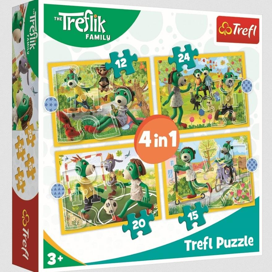 Wspólne zabawy Treflików to puzzle składające się z 4 niezależnych układanek, zaprojektowane z myślą o wszystkich fanach i fankach Rodziny Treflików. Po ułożeniu układanek powstaną obrazki o wymiarach 285x205 mm z głównymi bohaterami bajki - Treflikiem, Treflinką i Małym Wujciem.