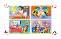 4 x Puzzle 8*12*15*20 - 4 układanki w 1 pudełku !!! o wymiarach 29x19.7 cm, wiek 4+. Jest to kontynuacja serii dla najmłodszych 4xPuzzle 4*5*6*7. Każde pudełko zawiera cztery tematycznie powiązane obrazki o różnym poziomie trudności. Dzięki temu maluch może stopniowo stawiać czoła coraz trudniejszym wyzwaniom, czerpiąc satysfakcję z każdego kolejnego sukcesu. Duże elementy oraz zaokrąglone krawędzie obrazków powodują, iż produkt ten jest bardzo bezpieczny, a zarazem trwały i estetyczny. Bogate i różnorodne wzornictwo umożliwi dziecku poszerzenie wiedzy o otaczającym je świecie oraz zainspiruje do rozszerzenia kręgu swoich zainteresowań.