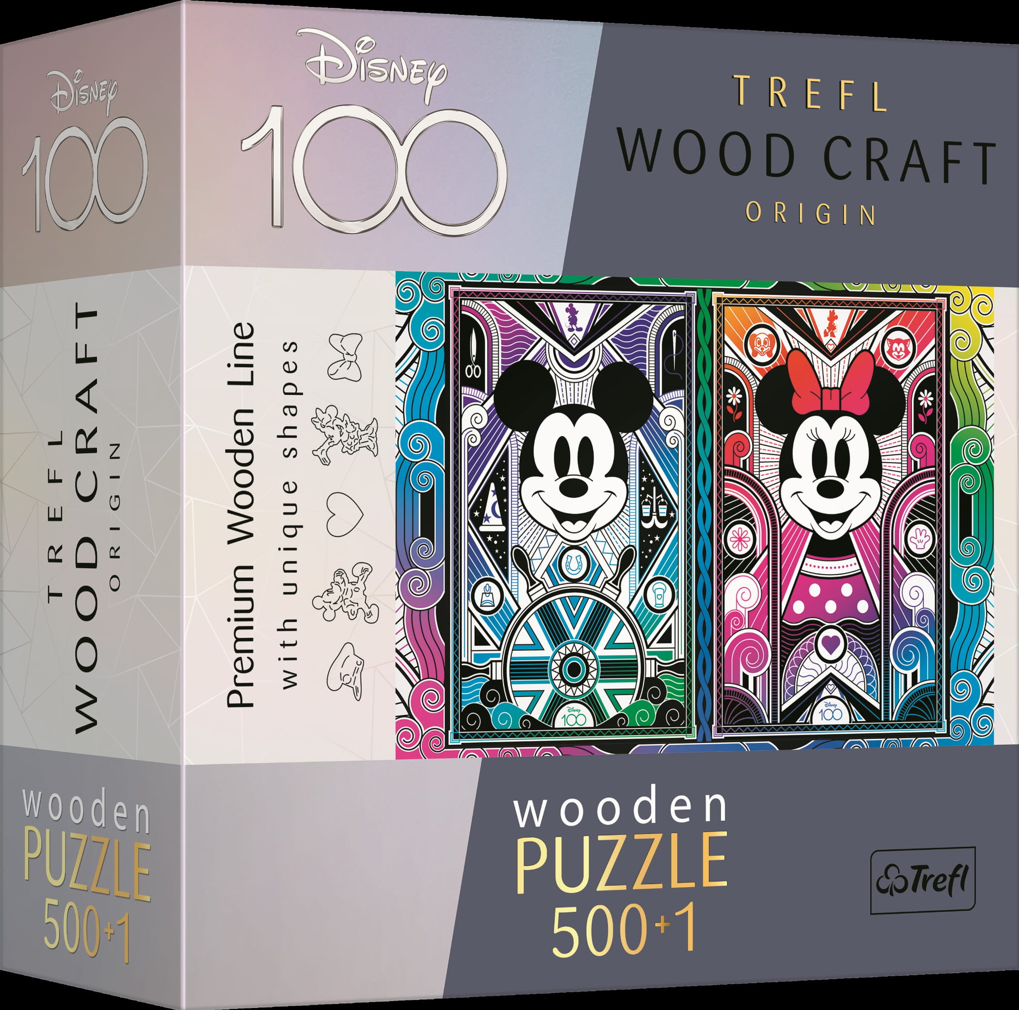 Wykorzystując unikatowy krój puzzli oraz oryginalne puzzlowe figurki, ułóż obraz przedstawiający kultową Myszkę Miki i Minnie.