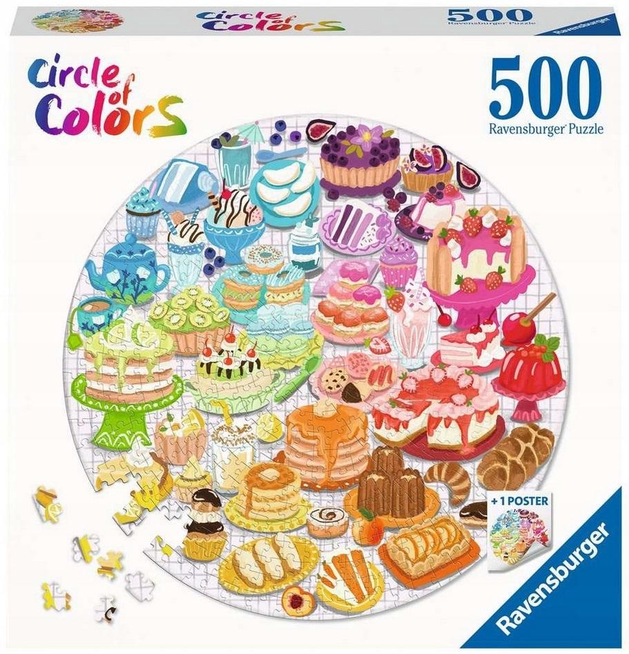 Puzzle 2D: Paleta kolorów 500 elementów dla dorosłych - po ułożeniu mają kształt koła, w którym zamknięto motyw wielokolorowego obrazka.