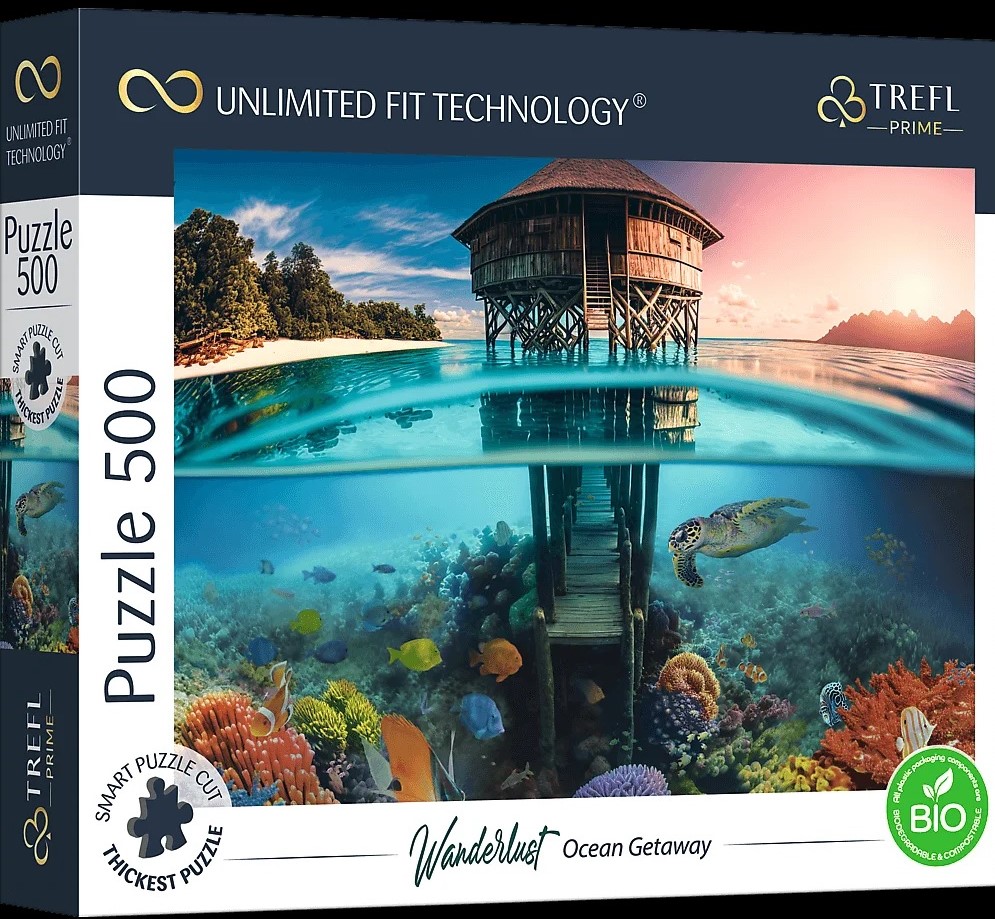 Puzzle z serii Trefl Prime Unlimited Fit Technology składające się z 500 elementów są przeznaczone dla prawdziwych miłośników układanek! Puzzle Ocean Gateway przedstawiają piękny widok na morski świat i domek na wodzie.