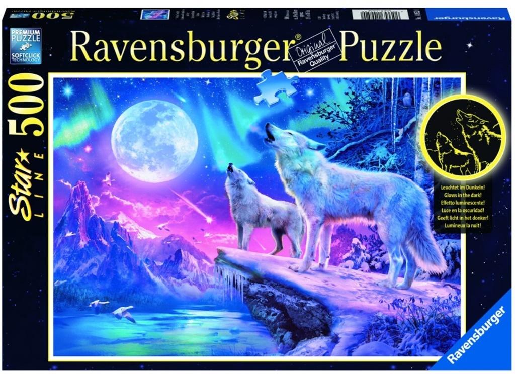 Puzzle 500 elementów Ravensburger z wyjątkową ilustracją wilków w zorzy polarnej. Ponadto seria Star line charakteryzuje się tym, ze elementy obrazka są wykończone specjalną farbą, dzięki czemu świecą w ciemności. Po ułożeniu powstanie obrazek o 49 x 36 cm.