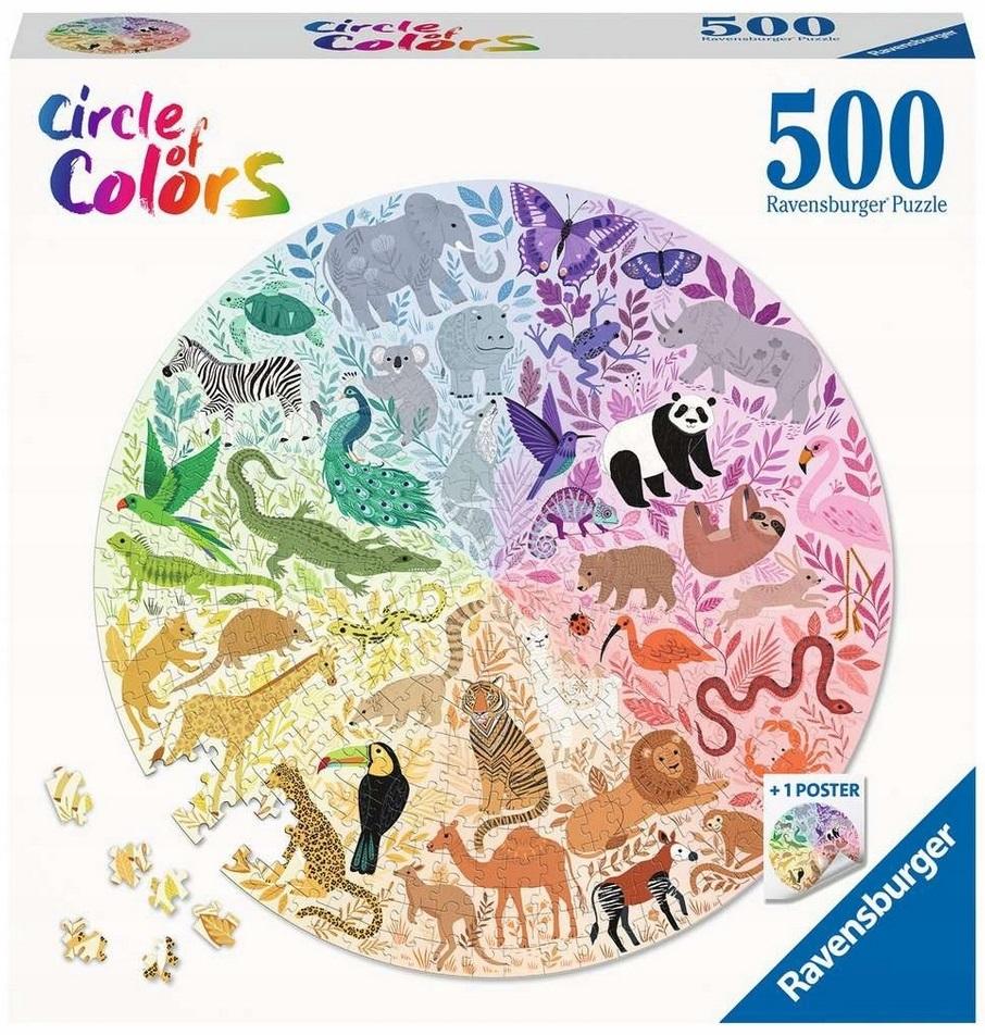 Puzzle 2D: Paleta kolorów 500 elementów dla dorosłych - po ułożeniu mają kształt koła, w którym zamknięto motyw wielokolorowego obrazka.