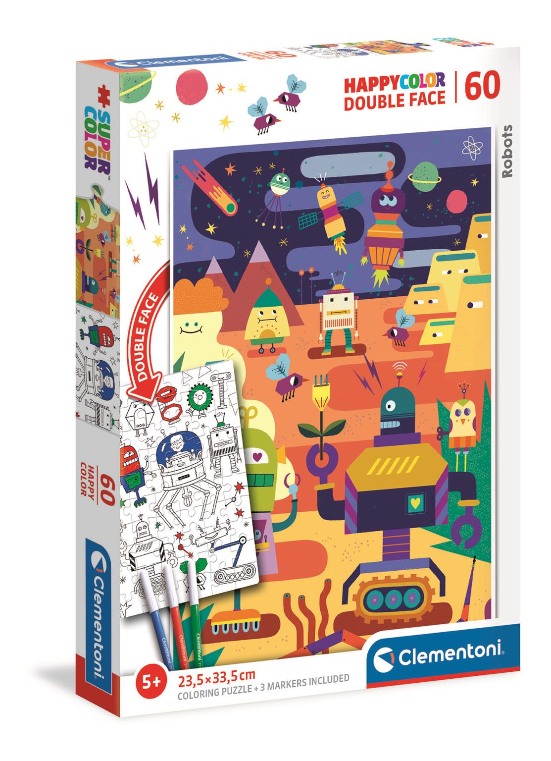 Wysokiej jakości Puzzle Happy Kolor Double Face Robot cenionej marki Clementoni, składające się z 60 elementów. Wymiary obrazka po ułożeniu 23,5x33,5 cm.
