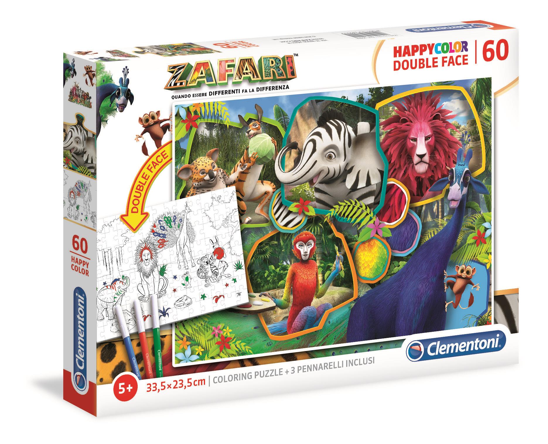 Wysokiej jakości Puzzle Happy Kolor Double Face Zafari cenionej marki Clementoni, składające się z 60 elementów. Wymiary obrazka po ułożeniu 33,5x23,5 cm