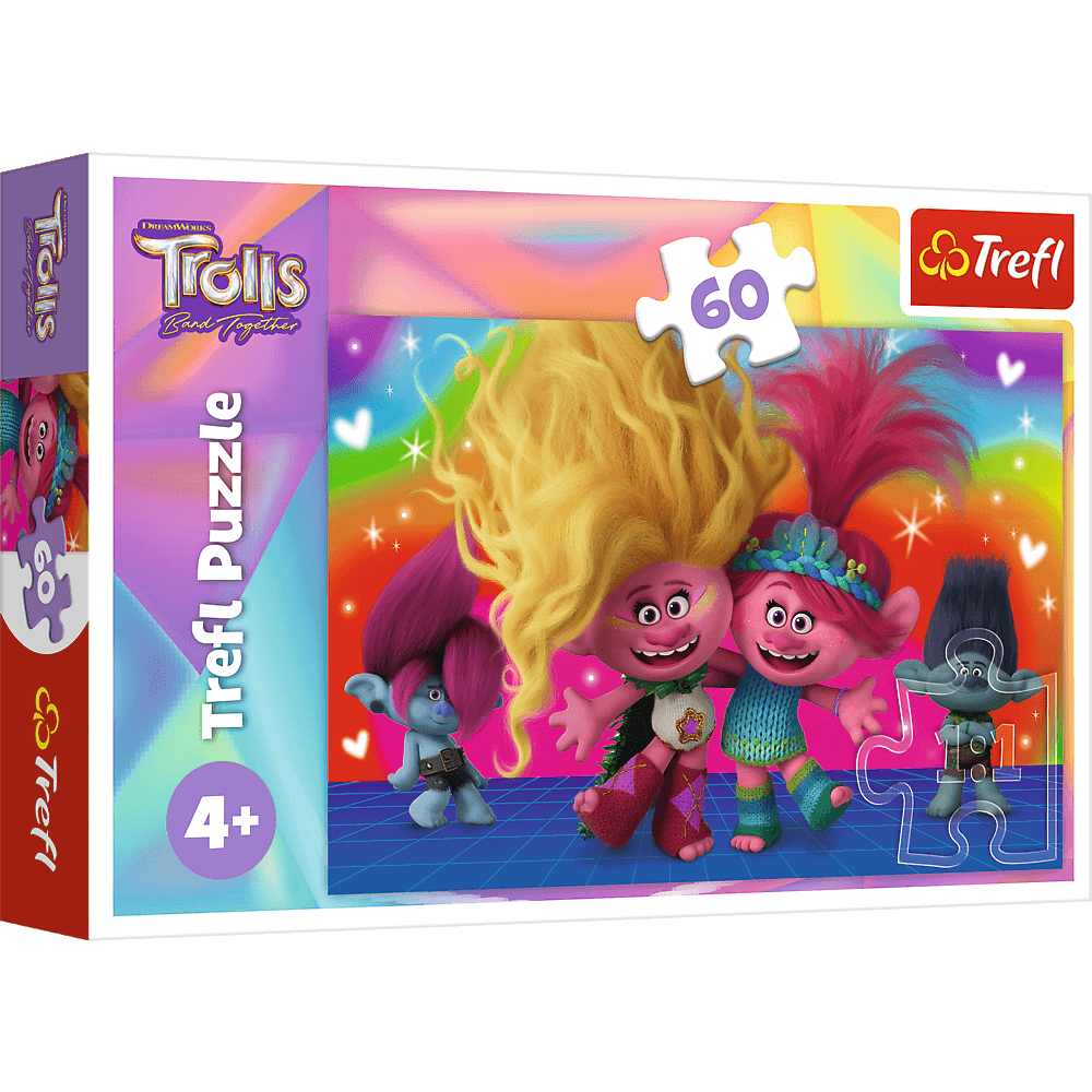 Przyjacielskie Trolle to puzzle składające się z 60 elementów, zaprojektowane z myślą o wszystkich miłośnikach filmu Trolle. Po ułożeniu układanki powstanie obrazek o wymiarach 330x220mm.