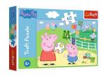 Zabawy w gronie przyjaciół to puzzle składające się z 60 elementów, zaprojektowaną z myślą o wszystkich fanach i fankach bohaterów bajki Świnka Peppa. Po ułożeniu układanki powstanie obrazek o wymiarach 330x220mm. Produkt został wykonany z wysokiej jakości materiałów, z zastosowaniem specjalnego kalandrowanego papieru odbijającego światło, co ułatwia układanie. Produkt został wyprodukowany w Polsce, a do produkcji zostały użyte materiały ekologiczne. Dla dzieci w wieku od 4 lat
