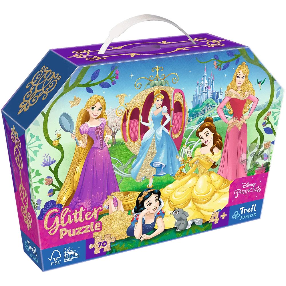 Wesołe księżniczki - puzzle glitter marki Trefl Junior to układanka składająca się z 70 elementów. Jest ozdobiona delikatnym złotym brokatem, który sprawia, że opakowanie i poszczególne elementy pięknie się mienią.