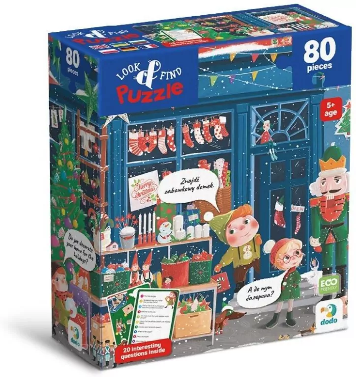 Szukasz ciekawej i rozwijającej układanki dla dzieci? Podaruj maluchowi prawdziwą noworoczną przygodę z puzzlami Look & Find Zimowe święta od marki Dodo! Ten rozwijający zestaw puzzli z 80 elementami łączy układanie z wesołą grą na spostrzegawczość: po ukończeniu obrazka dziecko ma za zadanie odnaleźć ukryte obiekty na podstawie podpowiedzi ze specjalnych kart.