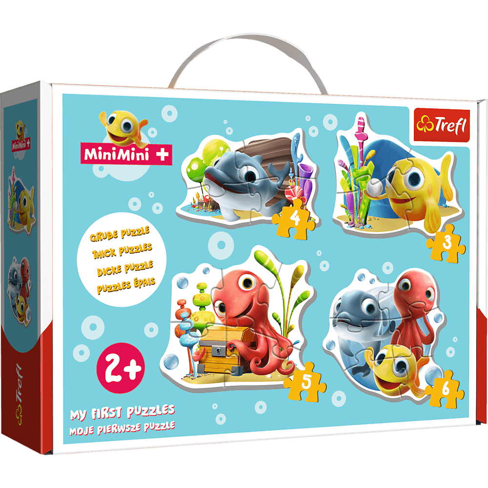 Baby Puzzle ze znanymi wszystkim małym dzieciom bohaterami kanału MiniMini. Puzzle zostały wykonane z grubego kartonu i są idealne dla dzieci już od 2 roku życia. Żywe kolory i przyjazne kształty zachęcają maluchy do zabawy. Puzzle składają się z 4 niezależnych układanek, każda o innej ilości elementów 3, 4, 5, 6 i prezentują rybki z uwielbianej przez najmłodszych stacji MiniMini