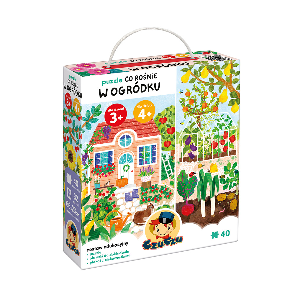 Soczyście kolorowa i duża układanka składa się z 40 elementów i przedstawia kwitnący ogród i sad. 32 owoce i warzywa znajdują się na dodatkowych kafelkach do dokładania. Umożliwia to mnóstwo fascynujących i wszechstronnie rozwijających zabaw, które pozwolą lepiej zrozumieć i zapamiętać, co rośnie w ogródku. Mnóstwo przyrodniczych ciekawostek znajdziecie na plakacie dołączonym do puzzli. Edukacyjny zestaw sprawdzi się jako pomysł na mądry prezent dla ciekawego świata przedszkolaka.