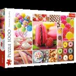 Puzzle 1000 elementów przedstawiające kolaż zdjęć ze słodkimi, kolorowymi cukierkami. Puzzle mogą być ozdobą ściany w kuchni i jadalni, a także pokoju dziecka. Po ułożeniu powstanie obrazek o wymiarach 68x48 cm. Wysoką jakość, nasycenie kolorów i bezpieczeństwo układania zapewnia kalandrowany papier odbijający światło, pokryty ekologicznymi farbami spożywczymi.