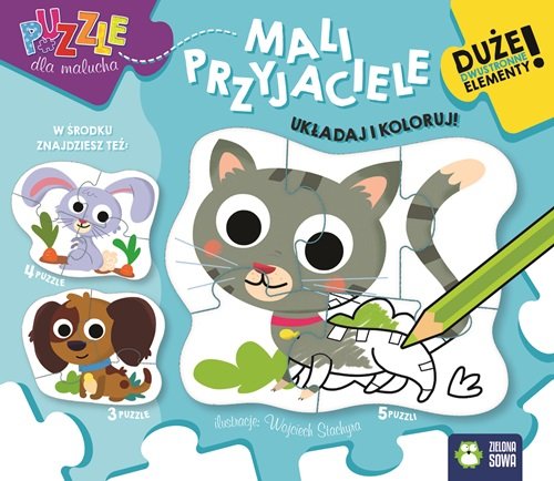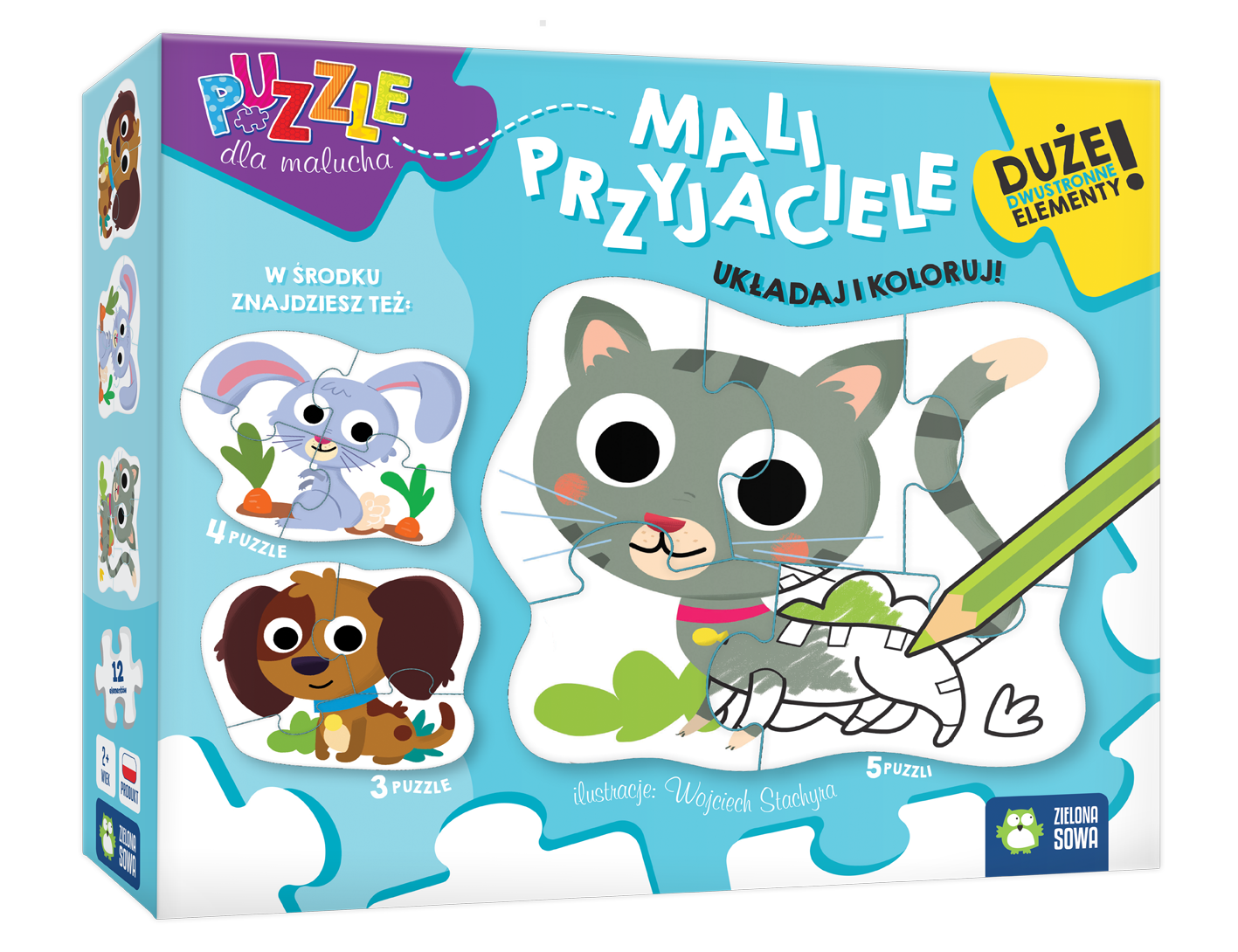 Poznaj najlepszych małych przyjaciół dziecka: radosnego pieska, rozbrykanego kotka i kicającego królika. Seria wyjątkowych puzzli dostosowanych są do umiejętności małych dzieci, które rozwijają swoje zdolności manualne i poszerzają wiedzę o świecie. W pudełku znajdują się 3 układanki. Każda z nich składa się z innej liczby puzzli – 3, 4 lub 5 elementów – każda kolejna to większe wyzwanie! Duże, sztywne elementy i zaokrąglone rogi to gwarancja jakości i bezpieczeństwa. Dodatkowo na odwrocie puzzli znajduje się kolorowanka!