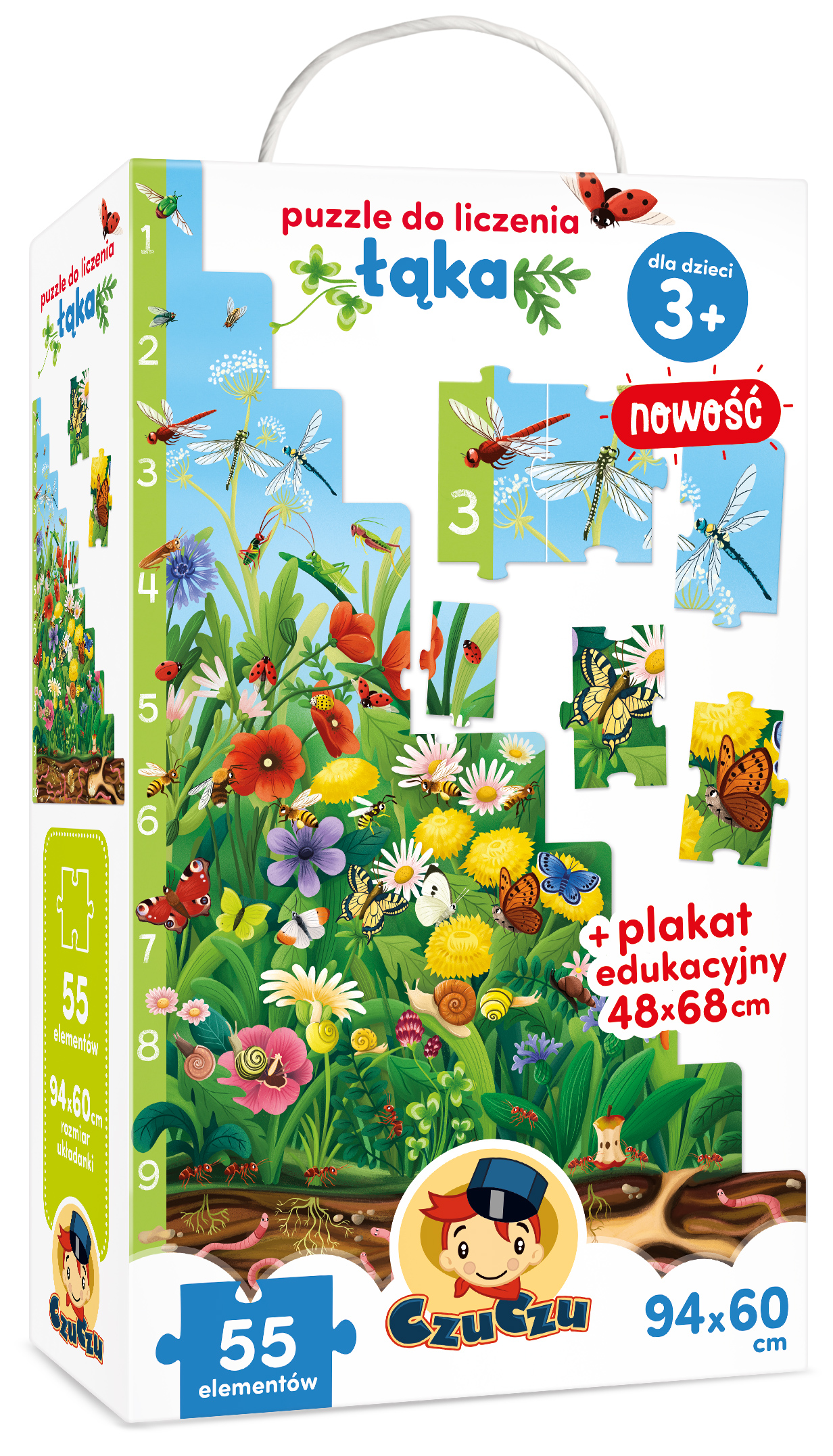 Układajcie puzzle i bawcie się liczeniem Trenujcie spostrzegawczość Poznajcie fascynujący świat przyrody W każdym z 10 rzędów innowacyjnych puzzli znajduje się różna liczba niewielkich mieszkańców łąki: 1 latający chrząszcz, 2 muchy, 3 ważki, 4 koniki polne, 5 biedronek, 6 pasiastych owadów, 7 motyli, 8 ślimaków, 9 mrówek i 10 podziemnych stworzonek – dżdżownic i pędraków. Wszystkie rzędy połączone razem tworzą ilustrację o imponujących rozmiarach. Na edukacyjnym plakacie znajdziesz mnóstwo ciekawostek o niewielkich mieszkańcach łąki. To idealny pomysł na edukacyjny prezent.