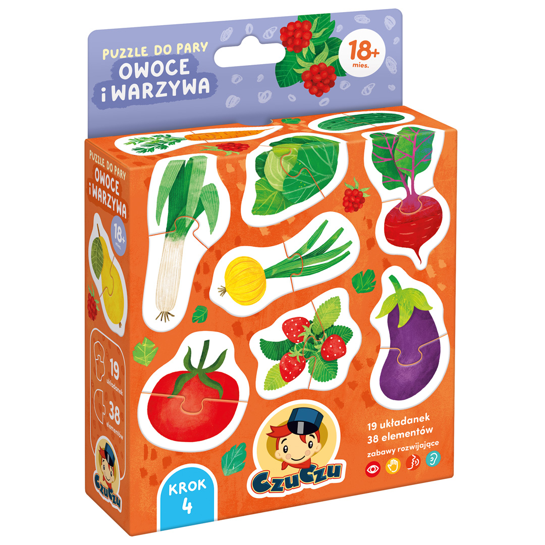 Hej, dzieciaki! Czy wiecie, co rośnie w ogrodzie i sadzie? Puzzle do pary Owoce i warzywa to edukacyjny zestaw, który zawiera 19 kolorowych, dwuelementowych układanek!