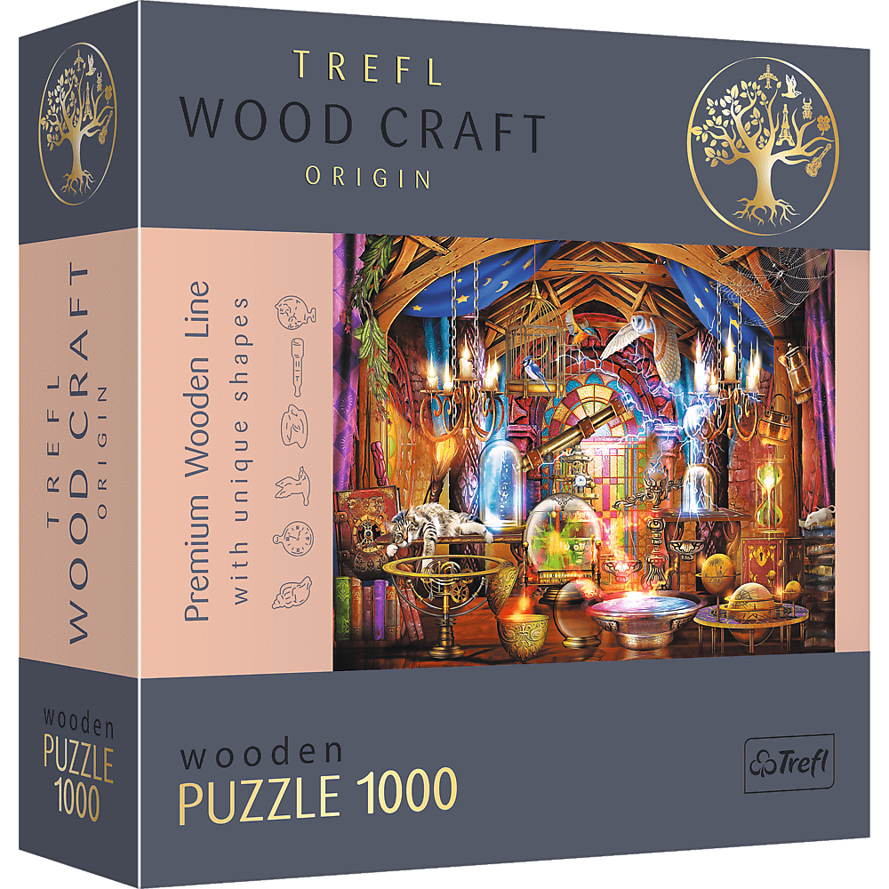 Seria puzzli 1000 elementów jest idealna dla wszystkich miłośników układanek, pozwoli stworzyć obrazek o wymiarach 51,9 x 37,5 cm przedstawiający czarodziejską komnatę, miejsce uprawiania magii i czarów. Układanka została wykonana z drewna, a opakowanie przyjazne środowisku w całości z tektury. Puzzle zawierają nieregularne elementy oraz 100 figurek w kształcie zwierząt.