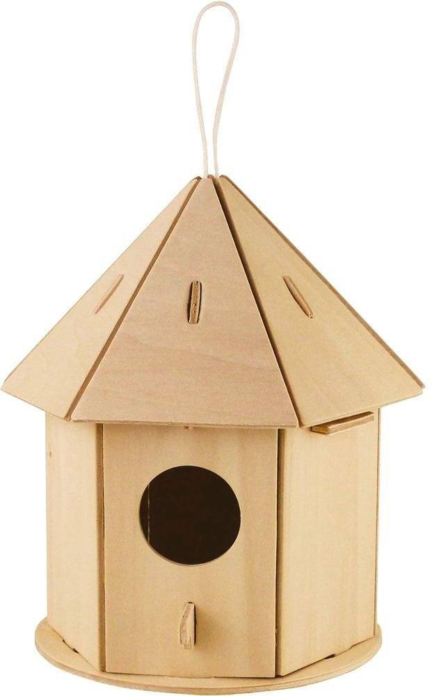 Seria drewnianych puzzli 3D składająca się z modeli karmników dla ptaków, które po złożeniu można pomalować.