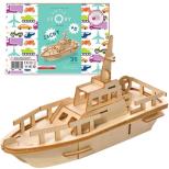 Drewniane puzzle 3D w kształcie Jachtu. Zestaw został wykonany z wysokiej jakości sklejki i jest w postaci arkuszy z wstępnie wyciętymi i ponumerowanymi elementami. Przed montażem należy oddzielić części od wykroju, a następnie połączyć bez użycia kleju, zgodnie ze szczegółową instrukcją dołączoną do opakowania. Zabawka edukacyjna, która po złożeniu może również służyć jako dekoracja. Uwaga - zestaw może zawierać małe elementy, podczas składania puzzli, dzieci muszą pozostać pod opieką dorosłych.