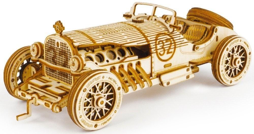 Drewniane puzzle 3D w kształcie klasycznego samochodu wyścigowego, wykonane z wysokiej jakości sklejki. Zestawy mają postać arkuszy z wstępnie wyciętymi i ponumerowanymi elementami, które przed montażem należy oddzielić od wykroju, a następnie połączyć bez użycia klej, zgodnie ze szczegółową instrukcją dołączoną do opakowania. Dzięki wykorzystaniu nowoczesnej technologii obróbki drewna, model charakteryzuje duża ilość detali, a jego budowa jest ciekawym doświadczeniem (montaż wybranych elementów może wymagać użycia kleju do drewna- zestaw nie zawiera kleju).