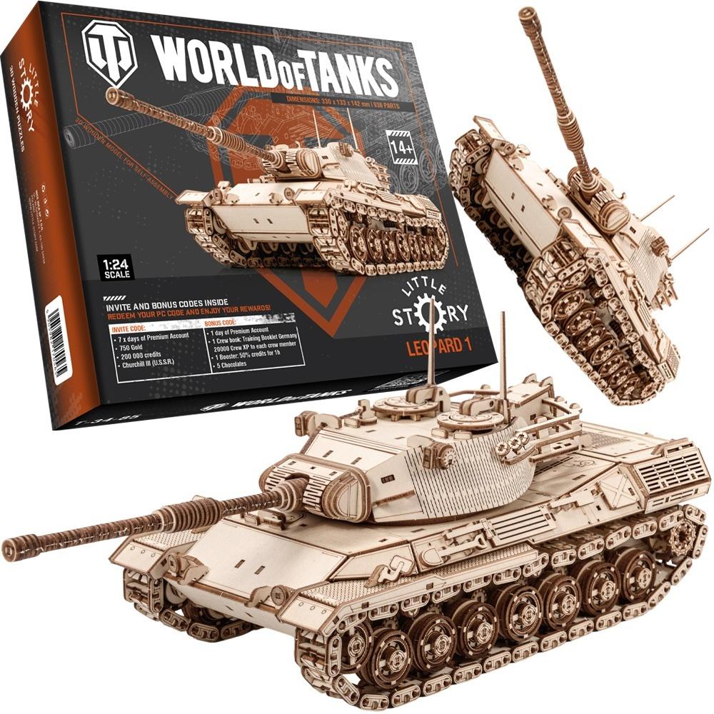 Drewniane puzzle 3D w kształcie czołgu Leopard 1 Zestaw został wykonany z wysokiej jakości sklejki i jest w postaci arkuszy z wstępnie wyciętymi i ponumerowanymi elementami. Przed montażem należy oddzielić części od wykroju, a następnie połączyć bez użycia kleju, zgodnie ze szczegółową instrukcją dołączoną do opakowania. Zabawka edukacyjna, która po złożeniu może również służyć jako dekoracja. Uwaga - zestaw może zawierać małe elementy, podczas składania puzzli, dzieci muszą pozostać pod opieką dorosłych.