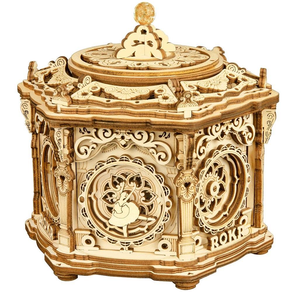 Puzzle 3D w kształcie zdobionej szkatułki z pozytywką, wykonane z wysokiej jakości sklejki. Model posiada mechanizm, który po nakręceniu odtworzy melodię. Zestaw ma postać arkuszy z wstępnie wyciętymi i ponumerowanymi elementami, które przed montażem należy oddzielić od wykroju, a następnie połączyć zgodnie ze szczegółową instrukcją dołączoną do opakowania. Dzięki wykorzystaniu nowoczesnej technologii obróbki drewna, pozytywkę charakteryzuje duża ilość detali, a jej budowa jest ciekawym doświadczeniem.