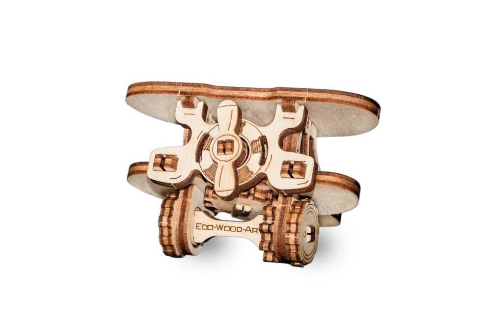 Mała, mechaniczna zabawka antystresowa w kształcie samolotu, wykonana z wysokiej jakości sklejki brzozowej. Zestawy mają postać arkuszy z wstępnie wyciętymi i ponumerowanymi elementami, które przed montażem należy oddzielić od wykroju, a następnie połączyć bez użycia kleju, zgodnie ze szczegółową instrukcją dołączoną do opakowania. Model zaprojektowany i wykonany w Europie.