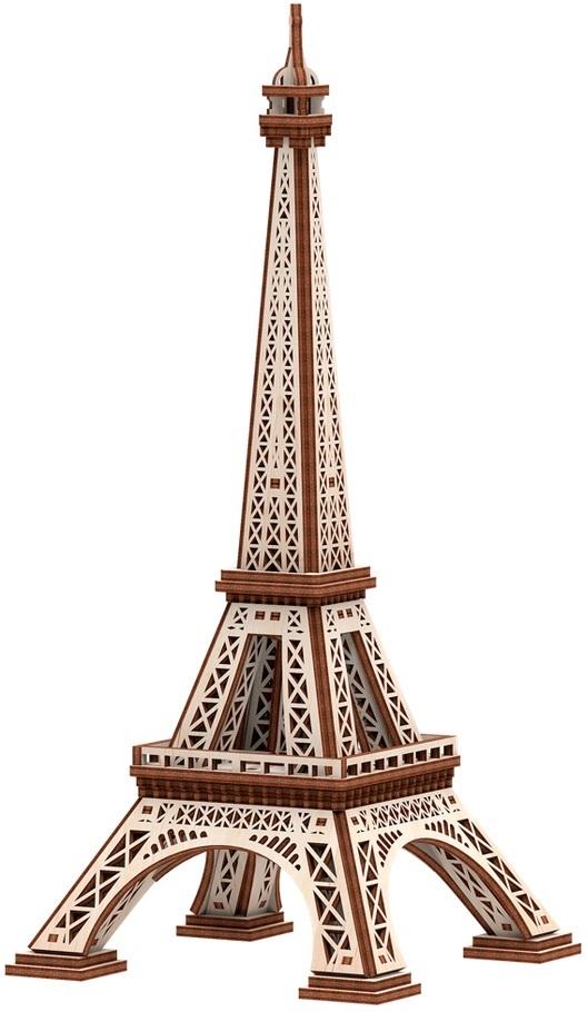 Drewniane puzzle 3D w kształcie Wieży Eiffla, wykonane z wysokiej jakości sklejki. Zestawy mają postać arkuszy z wstępnie wyciętymi i ponumerowanymi elementami, które przed montażem, należy oddzielić od wykroju, a następnie połączyć zgodnie ze szczegółową instrukcją dołączoną do opakowania. Dzięki wykorzystaniu nowoczesnej technologii obróbki drewna, wieża jest wierną miniaturą swojego oryginału, a jej budowa nie wymaga użycia kleju. Model zaprojektowany i wykonany w Europie.