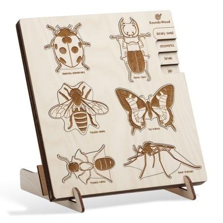 Edukacyjne drewniane puzzle dla dzieci Do biedronki przyszedł żuk Owady Cykle Rozwoju Sounds Wood Drewniana układanka przedstawiająca świat owadów marki Sounds Wood w formie różnokształtnych, drewnianych puzzli to świetne połączenie zabawy i nauki Zbadaj fantastyczny świat owadów. Poznaj: biedronkę siedmiokropkę, pszczołę miodną, pazia królowej, jelonka rogacza, komara brzęczącego i mrówkę rudnicę! Zobacz jakie przeobrażenia przechodzą w trakcie swojego życia. Przybliż swojemu dziecku świat entomologii. Sześć owadów pokazanych w czterech fazach rozwoju (aż 24 puzzle do odkrycia!) nie tylko pomoże w zrozumieniu otaczającej nas przyrody, ale również w rozwoju motoryki dłoni Twojej pociechy! To fascynujący prezent dla dziecka, który jednocześnie uczy, bawi, rozwija kreatywność, wspomaga koncentrację oraz zdolności manualne i językowe. Ekologiczne puzzle Owady wykonane są z drewna i wyprodukowane w Polsce dzięki czemu możemy kontrolować każdy etap ich powstawania, dbając by spełniały najwyższe standardy jakości i były w pełni bezpieczne dla najmłodszych.