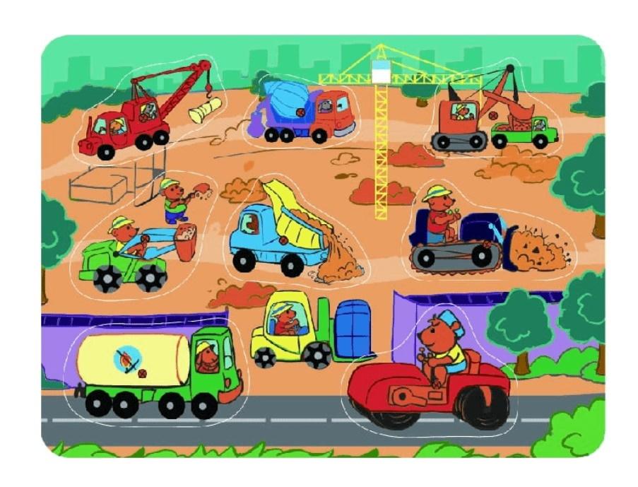 Drewniana układanka z pinezkami z motywem maszyn budowlanych firmy Top Bright. Układanka zawiera 8 elementów.