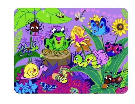 Drewniana układanka z pinezkami z motywem zwierząt mieszkających w trawie firmy Top Bright. Układanka zawiera 9 elementów.