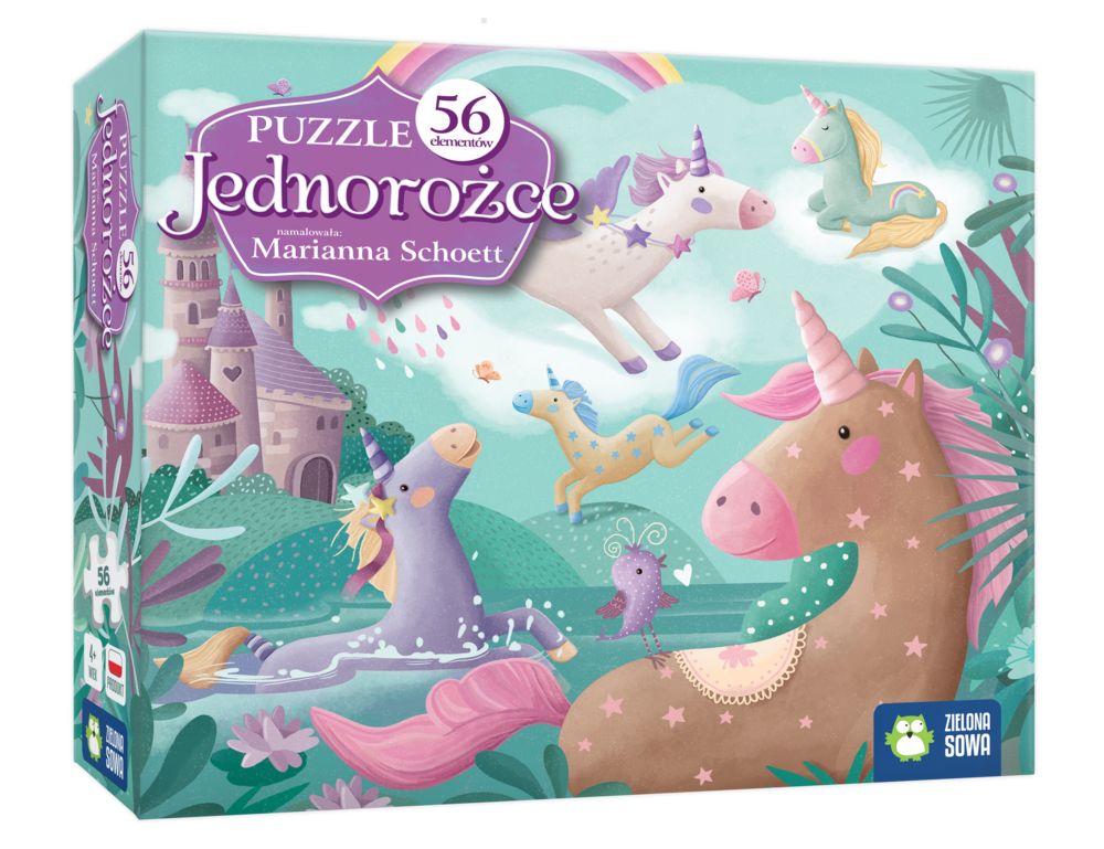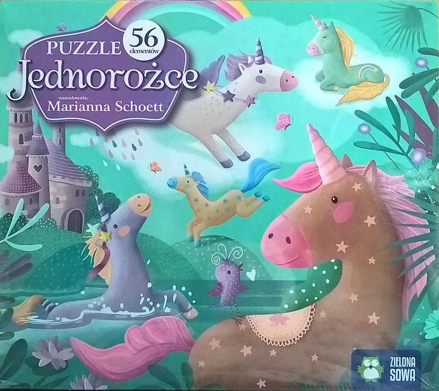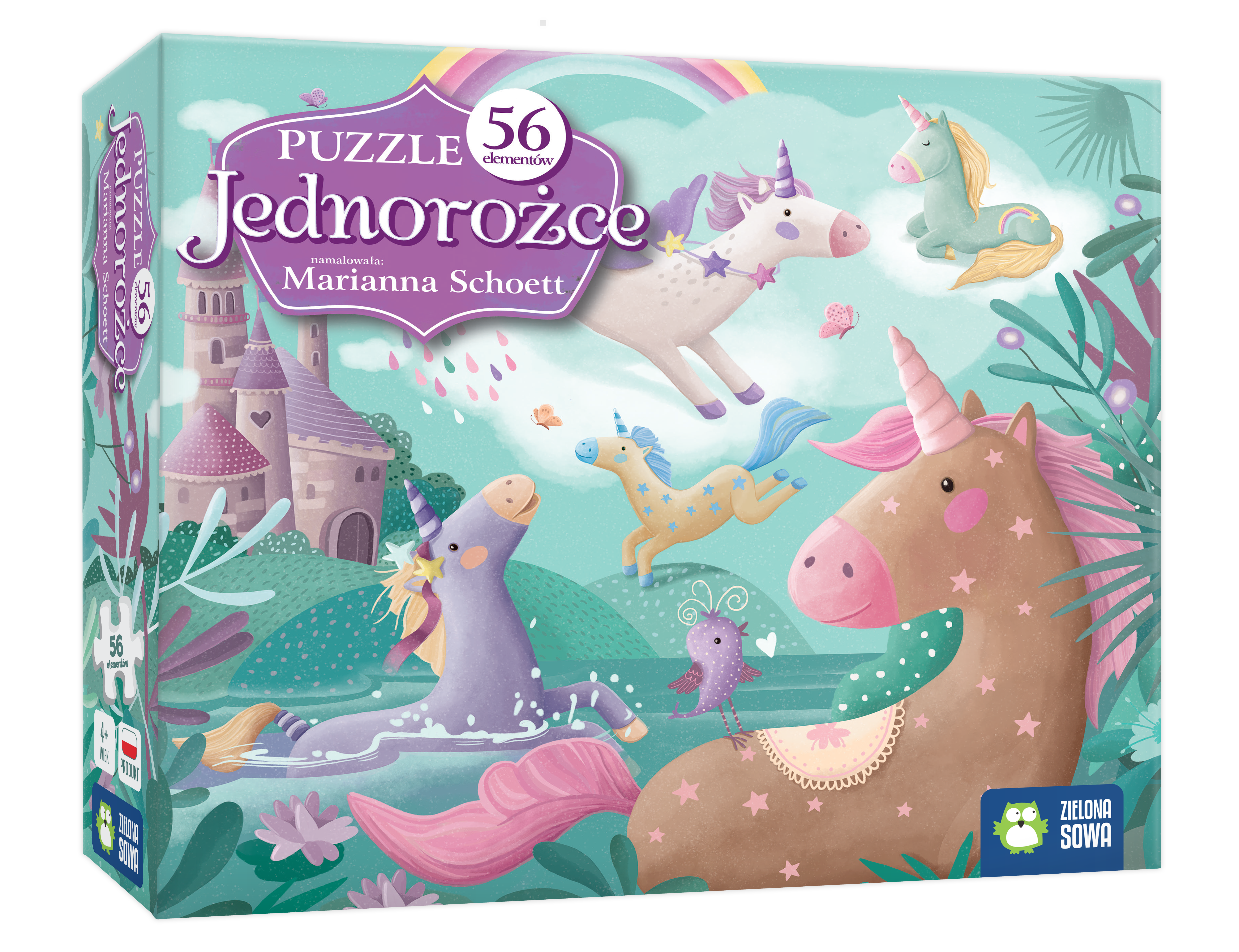 Wejdź do świata pełnego wesołych i przyjaznych jednorożców! Puzzle 56 elementów to idealny zestaw dla wszystkich miłośniczek tych uroczych i magicznych koników. Układanie obrazka to świetna zabawa, która dodatkowo przynosi mnóstwo korzyści - puzzle rozwijają wyobraźnię, poprawiają zdolności manualne i ćwiczą spostrzegawczość. Sztywne elementy to gwarancja jakości, która pozwoli długo cieszyć się układanką. W pudełku znajdziesz też podkładki pod kubek. Puzzle to doskonały prezent na każdą okazję. Po ułożeniu powstaje obrazek o wymiarach: 47 x 54,4 cm. Wiek 4+