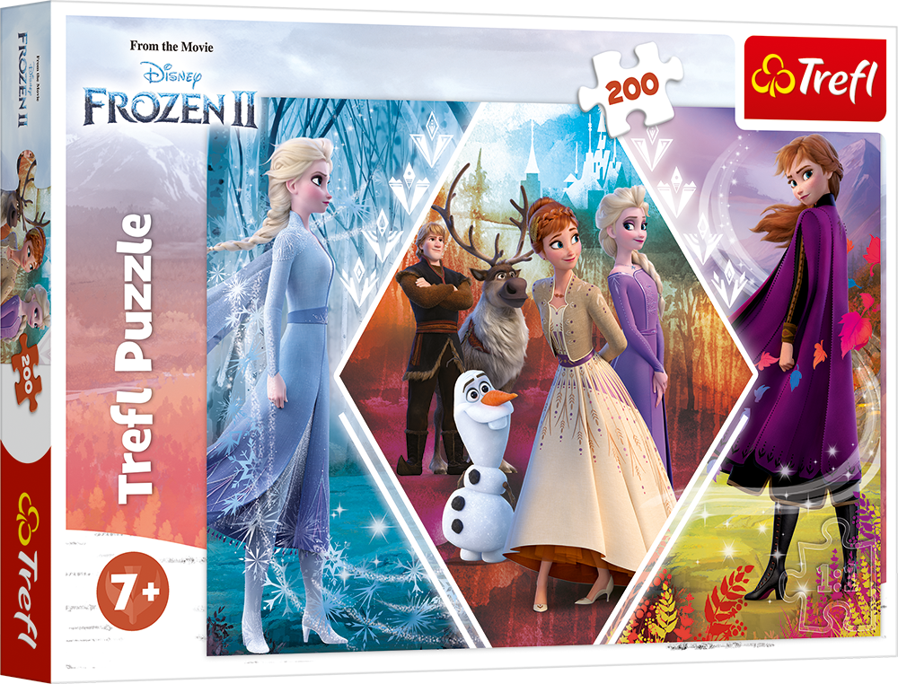 Puzzle 200 elementów z bohaterami filmu Disneya Frozen 2 (Kraina Lodu 2). Po ułożeniu powstanie obrazek o wymiarach 48x34 cm. Wysoką jakość, nasycenie kolorów i bezpieczeństwo układania zapewnia kalandrowany papier odbijający światło i wykorzystanie materiałów ekologicznych.