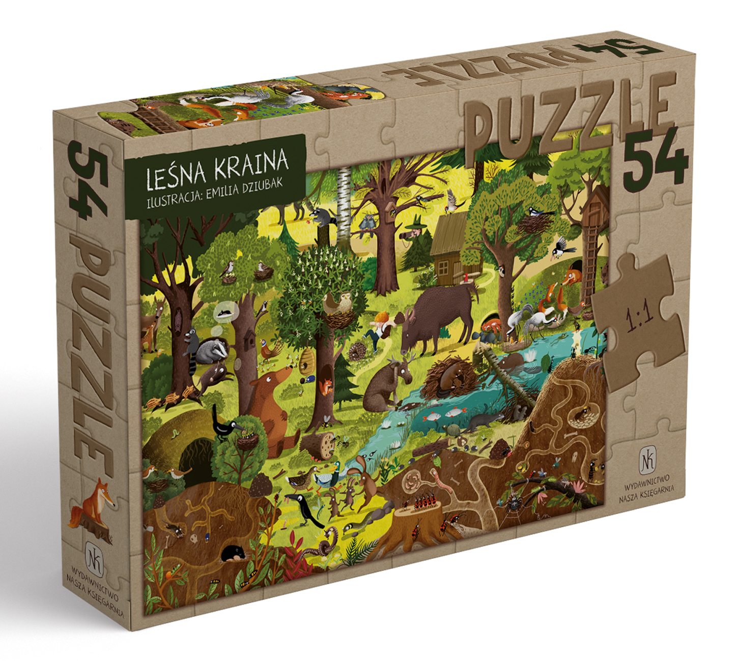 Czy zastanawialiście się kiedyś, jak wygląda życie w lesie? Kto śpi w dzień, a kto w nocy? Kto się z kim lubi? Kto jakie ma przysmaki? Układajcie puzzle i poznawajcie mieszkańców lasu. Piękna ilustracja autorstwa Emilii Dziubak, znanej małym czytelnikom między innymi z książek „Rok w lesie” czy „Proszę mnie przytulić”, podzielona została na 54 duże elementy. Po ich ułożeniu powstaje obrazek o wymiarach: 47 x 33 cm. Uwaga! Produkt nieodpowiedni dla dzieci w wieku poniżej 3 lat. Wyprodukowano w Polsce.