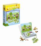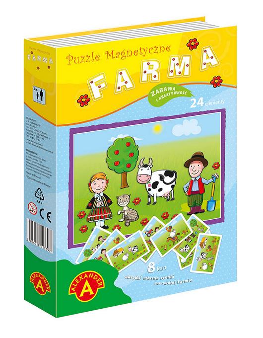 Puzzle magnetyczna - farma - to zabawka, która składa się z kolorowej planszy, 8 kart wzorów i 24 elementów z warstwą magnetyczną na odwrocie. Elementy z warstwą magnetyczną to obrazki związane tematycznie z wiejską zagrodą - postać gospodarza i gospodyni, koń, pies, kogut itp. Zabawa polega na układaniu na planszy z tłem poszczególnych obrazków tak, by tworzyły za każdym razem inna wymyśloną scenkę. Zawartość pudełka: 24 puzzle magnetyczne, tablica magnetyczna, 8 kart, instrukcja.
