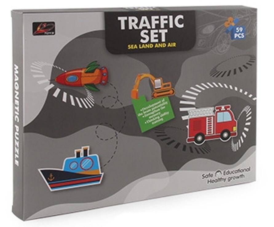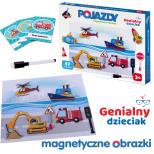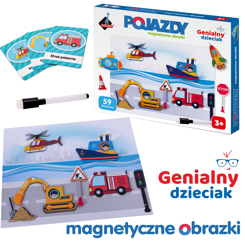 Puzzle magnetyczne - POJAZDYW zestawie plansza 27x22 cm oraz magnetyczne pojazdy, znaki drogowe, ostrzegawcze oraz pisak suchościeralny i karty z obrazkami pojazdów i ich nazwami po angielsku. Dziecko może układać na załączonej planszy pojazdy, tworzyć obrazki z załączonych elementów. Super zabawa, podczas której można nauczyć się nazw środków transportu i oznaczeń drogowych oraz łączyć poszczególne elementy. Wiek: 3+ Wymiary opakowania: 29.5x3x23.5 cm
