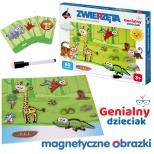 Puzzle magnetyczne - ZWIERZĄTKAW zestawie plansza 27x22 cm oraz magnetyczne zwierzątka i inne elementy przyrody oraz pisak suchościeralny i karty z obrazkami zwierząt i nazwami po angielsku. Dziecko może układać na załączonej planszy zwierzątka i tworzyć obrazki z załączonych elementów. Super zabawa, podczas której można nauczyć się nazw zwierząt, opisywać ich cechy charakterystyczne oraz łączyć poszczególne elementy. Wiek: 3+ Wymiary opakowania: 29.5x3x23.5 cm