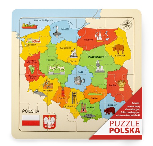 Mapa Polski Puzzle 25x25 cm Edukacyjna drewniana układanka rozwijająca zdolności manualne jednocześnie przekazując ciekawe informacje na temat charakterystycznych elementów związanych z różnymi regionami Polski. Puzzle POLSKA, przestawiają województwa z ich popularnymi symbolami. Pod wierzchnią warstwą puzzli znajdziemy mapę administracyjną Polski z podziałem na powiaty. Produkt zgodny z Europejską normą dotyczącą bezpieczeństwa zabawek. Kwalifikacja wiekowa +3. Indeks: D-144 puzzle drewniane Wymiar: 22x22 cm EAN: 5905422041448