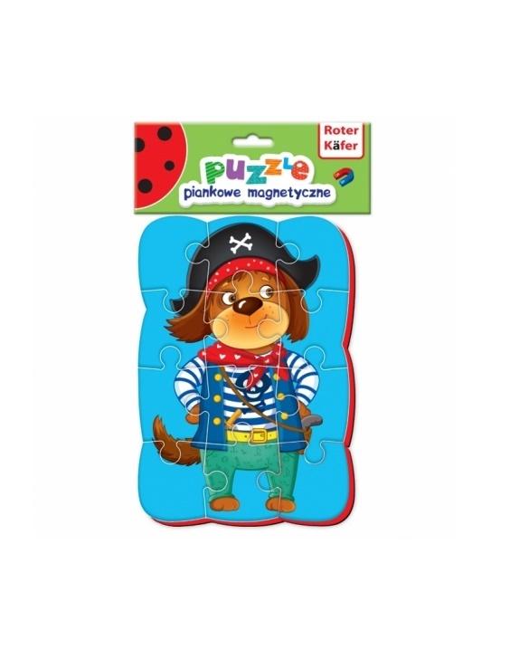 Śliczny obrazek magnetyczny przedstawiający odważnego pieska pirata pomoże maluchowi nauczyć się koncentrować uwagę, ćwiczy drobną motorykę, uczy cierpliwości. To właśnie puzzle są pierwszą zabawką dzieci, dlatego powinny być wygodne w układaniu i miłe w dotyku. Puzzle magnetyczne Roter Käfer są zrobione ze spienionego materiału, co powoduje, iż są one lekkie i miękkie. Puzzle składają się z 12 części. Dla ułatwienia na spodzie opakowania znajduje się obrazek przedstawiający puzzle po ułożeniu.