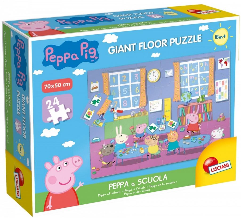 Wielkie puzzle podłogowe z bohaterami znanymi z kreskówki świnki Peppy. Tym razem bohaterowie znajdują się w szkole. Zestaw składa się z 24 wytrzymałych puzzli wysokiej jakości, które po złożeniu tworzą obrazek o wymiarach 70x50cm. Dla dzieci w wieku od 18 miesięcy
