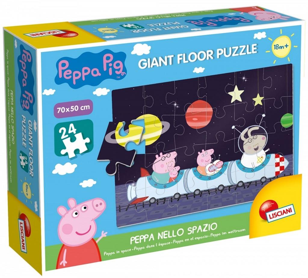Wielkie puzzle podłogowe z bohaterami znanymi z kreskówki świnki Peppy. Tym razem bhaterowie znajdują się w kosmosie. Zestaw składa się z 24 wytrzymałych puzzli wysokiej jakości, które po złożeniu tworzą obrazek o wymiarach 70x50cm. Dla dzieci w wieku od 18 miesięcy
