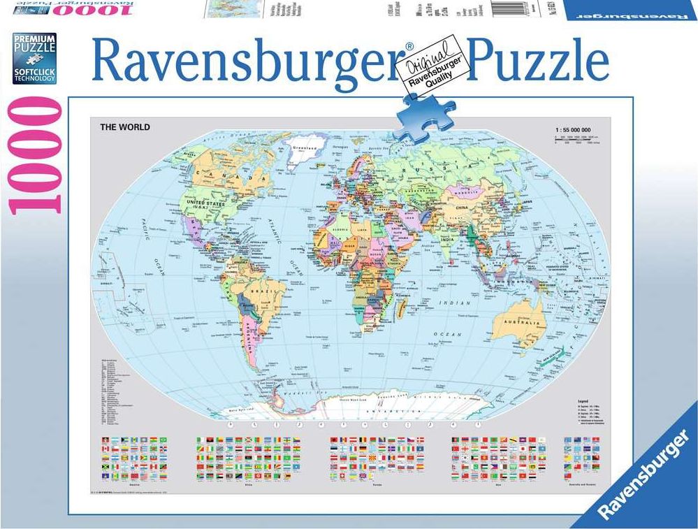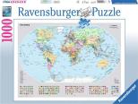 Seria puzzli 1000 elementów Ravensburger przedstawia wyjątkowe panoramy znanych miejsc, w tym przypadku polityczną mapę świata.