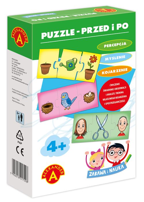 Zabawa polega na tym, by z rozłożonych i wymieszanych na stole 36 puzzli ułożyć 12 zestawów - każdy z nich składa się z 3 puzzli. Do ułożenia zestawu należy poszukiwać 2 bocznych puzzli z obrazkiem sprzed i po przebiegu procesu, łączących się z puzzlem środkowym sugerującym przyczynę zmiany.