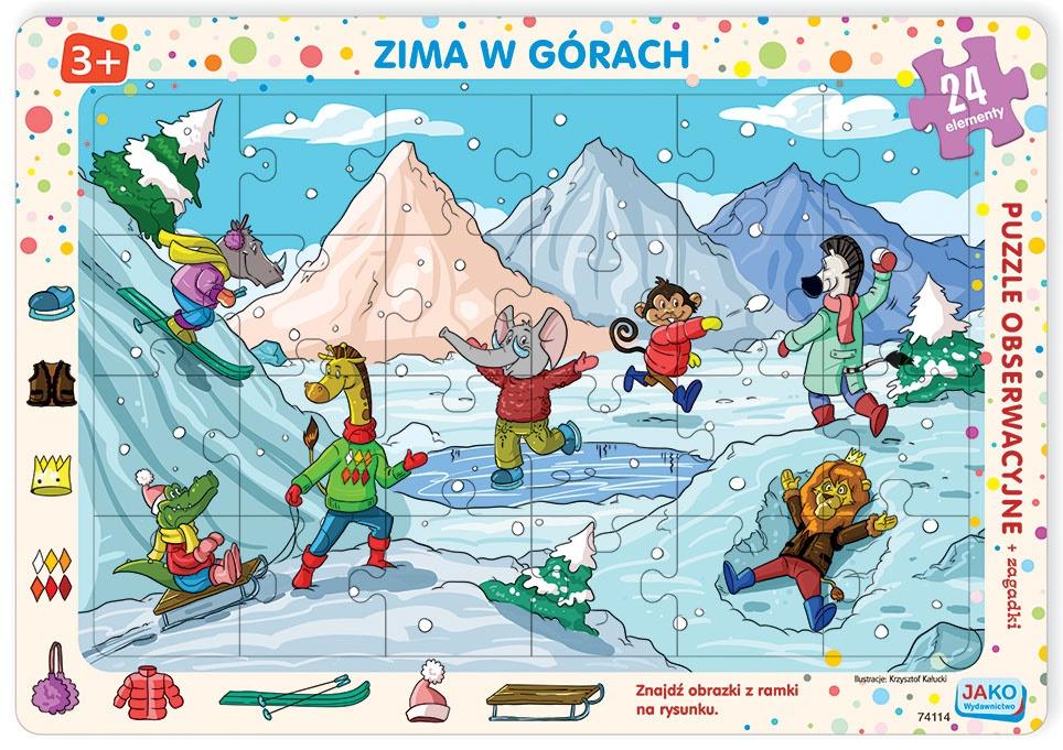 Puzzle ramkowe, obserwacyjne + zagadki. Stworzone z myślą o najmłodszych. Rozwijają zdolności manualne, spostrzegawczość i wyobraźnię przestrzenną. Pierwszym etapem zabawy jest ułożenie puzzli, następnie należy odnaleźć obrazki z ramki na ilustracji. Na koniec rozwiązać zagadki znajdujące się na odwrocie.