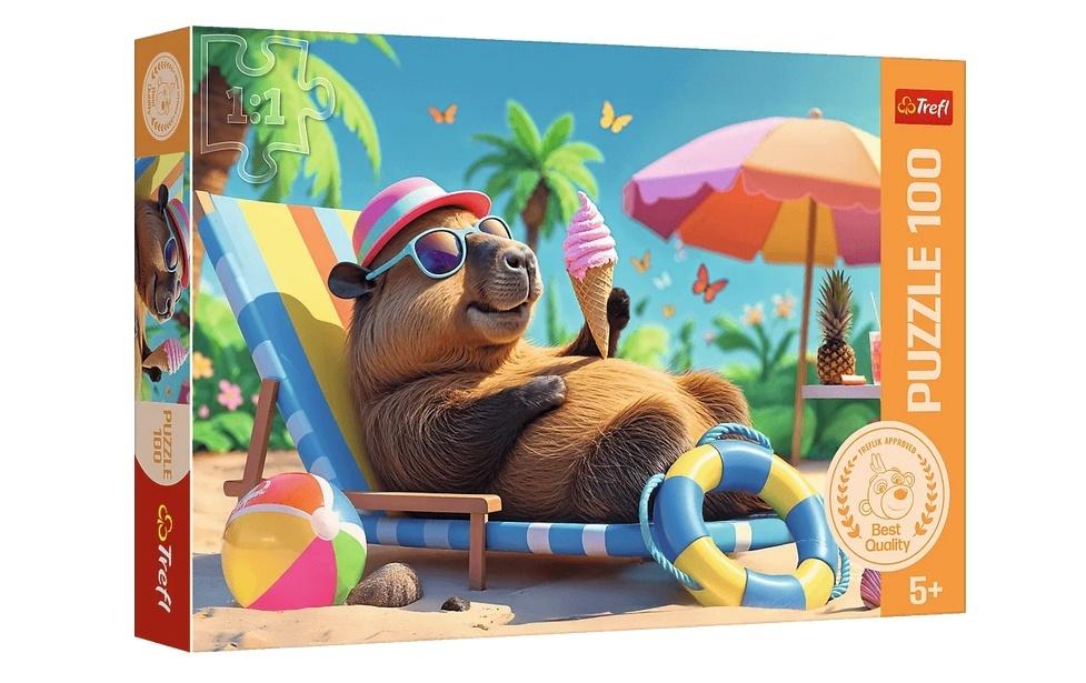 Relaks w stylu kapibary to puzzle składające się ze 100 elementów, zaprojektowane z myślą o małych fanach zwierząt. Po ułożeniu układanki powstanie obrazek o wymiarach 410x275 mm, przedstawiający zrelaksowaną kapibarę na plaży. Produkt wykonano z wysokiej jakości materiałów, z zastosowaniem specjalnego kalandrowanego papieru, który odbija światło, co ułatwia układanie. Puzzle zostały wyprodukowane w Polsce, a do produkcji zostały użyte materiały ekologiczne. Dla dzieci w wieku od 5 lat