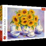 Puzzle składające się z 500 elementów przedstawiające słoneczniki. Po ułożeniu powstanie obrazek o wymiarach 580 x 340mm. Produkt został wykonany z wysokiej jakości materiałów, z zastosowaniem specjalnego kalandrowanego papieru odbijającego światło, co ułatwia układanie. Produkt został wyprodukowany w Polsce, a do produkcji zostały użyte materiały ekologiczne.