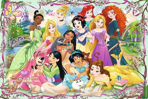 Puzzle 260 elementów z uwielbianymi przez dziewczynki Księżniczkami. Po ułożeniu powstanie obrazek o wymiarach 60x40cm. Wysoką jakość, nasycenie kolorów i bezpieczeństwo układania zapewnia wykorzystanie materiałów ekologicznych. Puzzle oparte na licencji Disney Princess.
