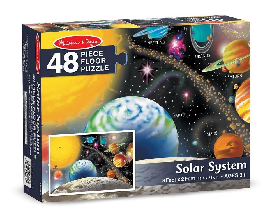 Duże i grube, kartonowe puzzle podłogowe. Z grafiką przedstawiającą planety układu słonecznego wraz z podpisami (w języku angielskim). 48 elementów.
