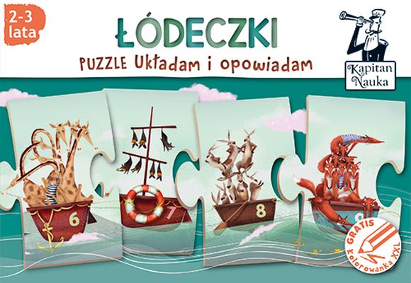 Jeden zaczytany mors, dwa niedźwiedzie przy popołudniowej filiżance herbaty, trzy ciekawskie szopy... A ile jest żółwi? I co robią lisy? Policzcie do 10, poznajcie nazwy egzotycznych zwierząt i opowiedzcie razem o niezwykłych morskich przygodach bohaterów puzzli. Łódeczki to wyjątkowa, dłuuuga układanka przygotowana z myślą o najmłodszych dzieciach. Duże, trwałe, wykonane z grubej tektury elementy z łatwością dopasuje do siebie nawet dwulatek. Dzięki dużemu formatowi 10-częściowych puzzli zabawa dostarczy dzieciom wiele radości, ćwicząc przy tym motorykę małą, umiejętność rozpoznawania kształtów i dopasowywania elementów. Seria Puzzle Układam i opowiadam wspomaga rozwój mowy i myślenia przyczynowo-skutkowego, pobudza wyobraźnię, doskonali spostrzegawczość oraz zdolność koncentracji. Fascynująca, pełna humoru, autorska grafika Pauliny Wyrt zachwyci i zachęci całą rodzinę do wspólnego spędzania czasu. Ta wyjątkowa ilustracja pomoże od najwcześniejszych lat harmonijnie kształtować wrażliwość estetyczną najmłodszych, a dla opiekunów będzie inspiracją do opowieści o przygodach zwierząt oraz prostej i przyjemnej nauki liczenia. Do zestawu puzzli dołączona jest kolorowanka XXL, którą można wykorzystać jako dekorację dziecięcego pokoju. Wymiar układanki po ułożeniu: 87 x 15 cm