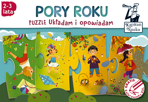 Wiosną Ania szaleje na hulajnodze i obserwuje motyle, latem Zosia puszcza latawca w słoneczny, wietrzny dzień, a jesienią Michał zbiera grzyby i kolorowe liście. Co będziemy robić zimą? Poznajcie razem pory roku, zaobserwujcie zmiany w przyrodzie i porozmawiajcie o tym, jak ubrać się odpowiednio do pogody za oknem. Pory roku to wyjątkowa, dłuuuga układanka przygotowana z myślą o najmłodszych dzieciach. Duże, trwałe, wykonane z grubej tektury elementy z łatwością dopasuje do siebie nawet dwulatek. Dzięki dużemu formatowi 10-częściowych puzzli zabawa dostarczy dzieciom wiele radości, ćwicząc przy tym motorykę małą, umiejętność rozpoznawania kształtów i dopasowywania elementów. Seria Puzzle Układam i opowiadam wspomaga rozwój mowy, myślenia przyczynowo-skutkowego, pobudza wyobraźnię, doskonali spostrzegawczość i zdolność koncentracji. Fascynująca, pełna humoru, autorska grafika Marty Szudygi zachwyci i zachęci całą rodzinę do wspólnego spędzania czasu. Ta wyjątkowa ilustracja pomoże od najwcześniejszych lat harmonijnie kształtować wrażliwość estetyczną najmłodszych, a dla opiekunów będzie inspiracją do opowieści o charakterystycznych cechach pór roku, zabawach i aktywnościach na świeżym powietrzu oraz do prostej i przyjemnej nauki kalendarza i nazw miesięcy. Do zestawu puzzli dołączona jest kolorowanka XXL, którą można wykorzystać jako dekorację dziecięcego pokoju. Wymiar układanki po ułożeniu to: 87 x 15 cm