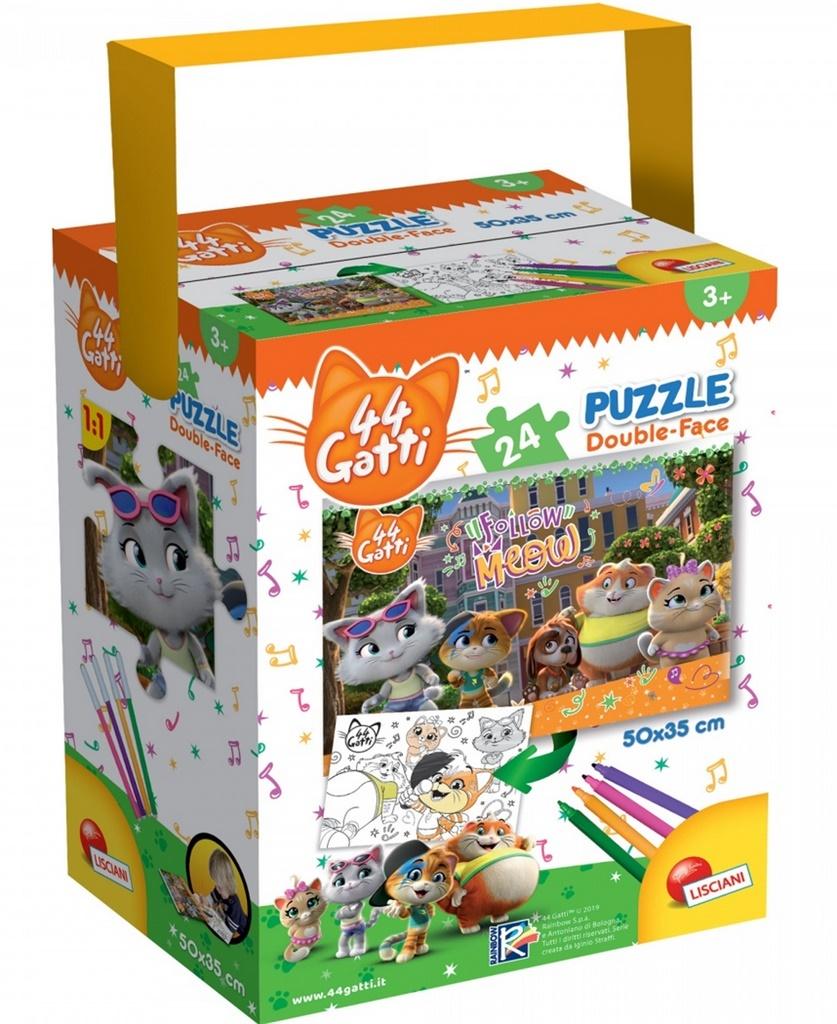 Wyjątkowe puzzle dwustronne inspirowane bajką 44 Koty. Opowiada ona o przygodach 4 kotów, które postanawiają stworzyć zespół muzyczny zwany Arcykotami. Jako miejsce ich schadzek wybierają stary garaż, który po zaadaptowaniu służy również jako miejsce spotkań innych bezdomnych kotów z okolicy. Zawartość opakowania umożliwia ułożenie obrazka o rozmiarze 70x35 cm, który widnieje na opakowaniu, a także pokolorowanie jego czarno-białego szablonu znajdującego się na odwrocie.